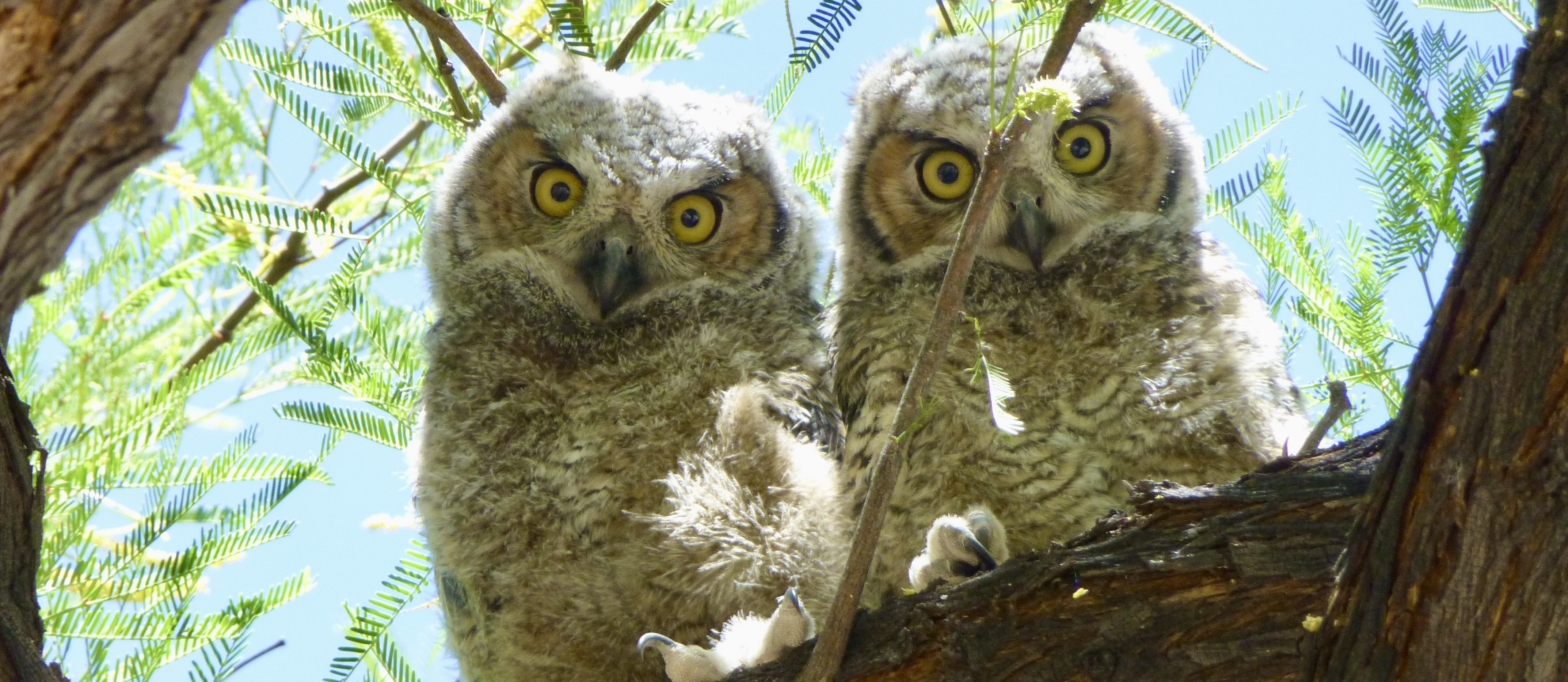 A pair of Great Horned Owls have chosen to nest in the middle of a busy retirement community in Tucson, Arizona. For two years the neighborhood has gathered under their mesquite tree to observe the growth and development of the chicks. The third year it was decided to put up a webcam for better viewing and to help cut down on the dog walkers, photographers, and cars stopping to view these remarkable creatures and listen to their various vocalizations. Tucson is quite hot from May-October, yet the birds have adapted well not only to the climate but to the very loud noises of roadwork, landscapers and house repair workers. They feed on neighborhood rats, snakes, scorpions and other birds and animals.